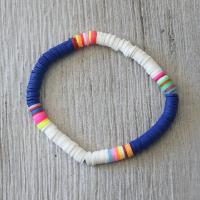Bracelet personnalisable en perle heishi blanches, dorées et colorées avec un mot à choisir.